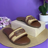 Sandalias planas para mujer de la marca GUESS, diseñadas para combinar estilo y comodidad. Cuentan con una suela baja y ergonómica en tono beige claro, y una tira frontal tejida en material tipo rafia natural, decorada con detalles en cuero sintético color caramelo. Al centro, destacan un elegante aplique metálico con el logotipo de GUESS, que añade un toque sofisticado. Ideales para looks casuales y veraniegos, estas sandalias son perfectas para el día a día o paseos al aire libre.